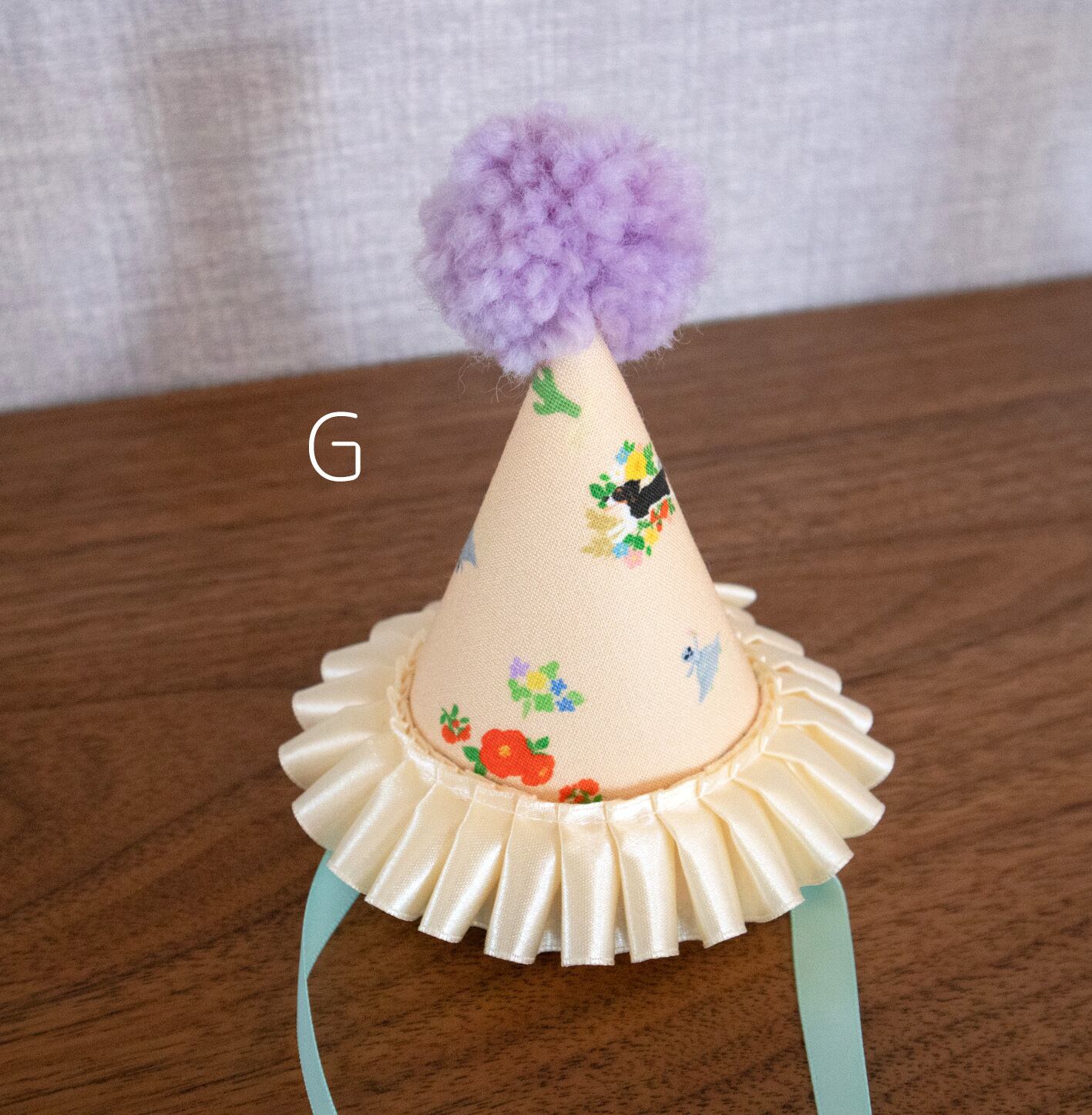 キャバリアとお花とアイスを持ってはしゃぐエイリアンの子供のfffujjjiオリジナルプリント生地で作ったわんこ用パーティハットです。アジャスター付きのゴムも付いているのでさっと固定してからリボンを結べます。