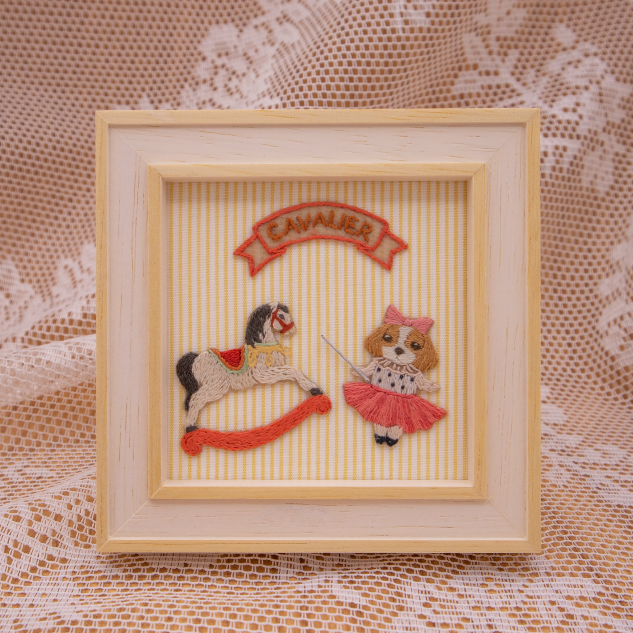 こちらはただただ可愛い木馬とキャバリアの女の子のミニアップリケ刺繍です。布から浮いて見えるように立体的に仕上げてあります。